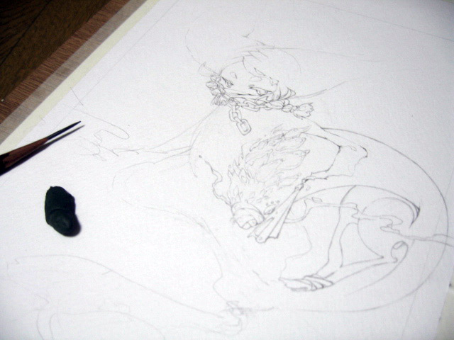 こういう作業をひたすら繰り返すので(最初に形を決めたあとから最後一時間までの間くらい)、寝かせて優しく描いていくのがベター